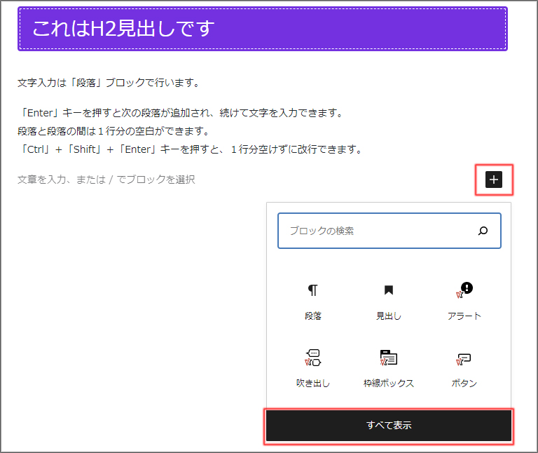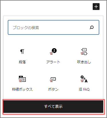 - ブロックリストに載っていない時は、「すべて表示」をクリックし、「ブロックパネル」から「段落」ブロックを開きます。