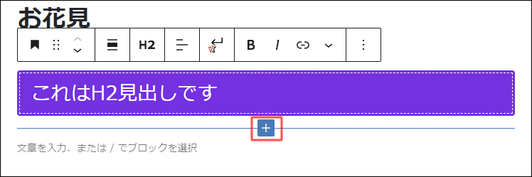 - ブロックを追加したいところにマウスのポインターを持っていきます。