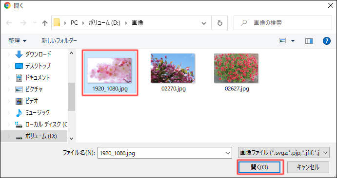 - エクスプローラーが開いたら、画像を保存しているフォルダーから挿入する画像を選択し、「開く」をクリック。