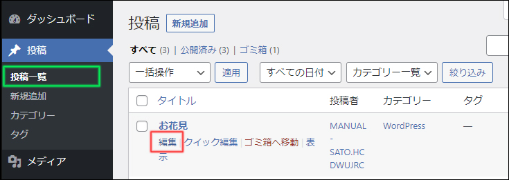 - 編集するタイトルの「投稿」をクリックして投稿画面を開きます。