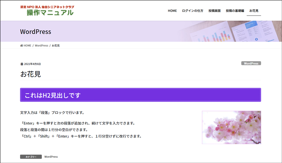 下記のように「タイトル」「見出し」「記事」「画像」の投稿内容が表示されたら完了です。