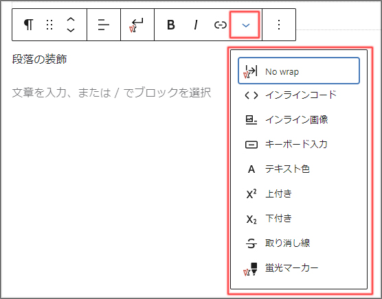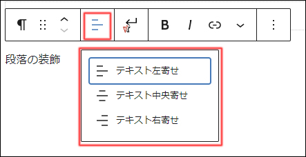 ツールバーはブロックにより表示される内容は異なります。 - 下記は代表的な「段落ブロック」のツールバーです。