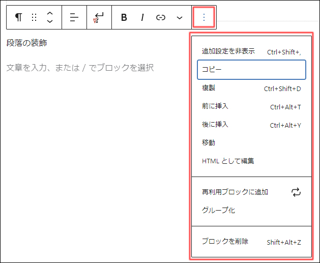 - ブロック全体をコピーして利用する場合は、「コピー」をクリックして任意の場所に貼り付けます。