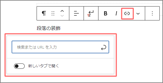 - 段落内の文字を選択後、リンクマークをクリック、URL入力欄にリンク先のURLを入力します。